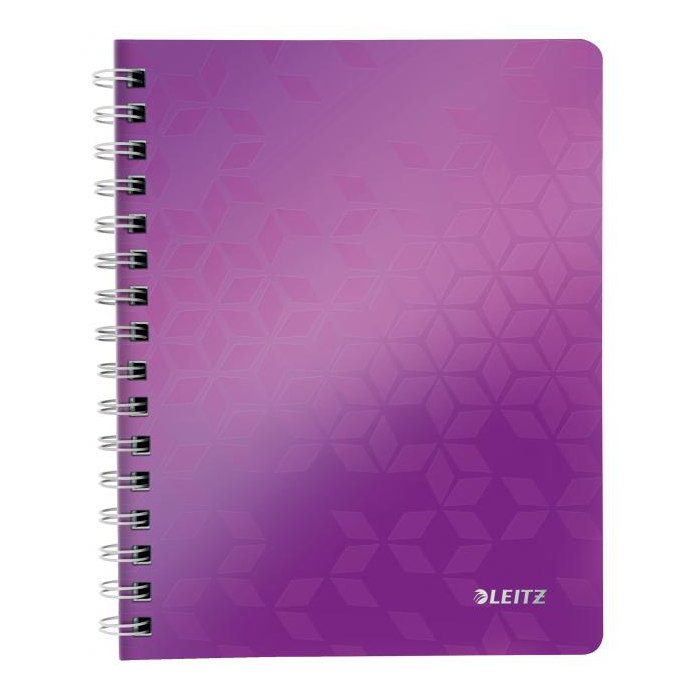 Krúžkový blok z dizajnovej rady Leitz WOW formátu A5 v žiarivých farbách. Vo vnútri biely papier s hmotnosťou 80 g / m2 s FSC® certifikáciou. Stránky sú perforované pre ľahšie odtrhávanie jednotlivých listov. Dvojitá drôtená krúžková väzba uľahčuje pretáčanie listov a zaisťuje dlhú životnosť bloku. Blok s pružnými doskami z polypropylénu obsahuje odnímateľné pravítko a vnútorné vrecko na uloženie voľných papierov, Väčšie balenie 6 ks. Farba purpurová. Úprava: linajková Počet listov: 80