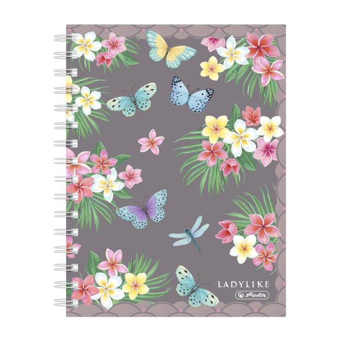Poznámkový blok Ladylike, 100 listov, úprava štvorčeková s okrajom, 70 g/m², jednoduchá, resp. dvojitá špirála, perforácia, zaoblené rohy, motív Motýľ.