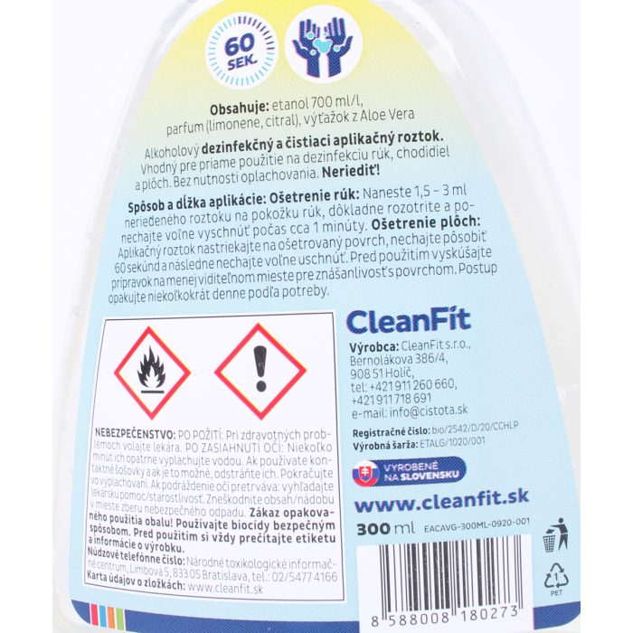 Použitie: Prípravok používajte neriedený! Prípravok je určený len na vonkajšie použitie! Pomocou rozprašovača nastriekajte aplikačný roztok na pokožku rúk, resp. na plochy a nechajte voľne vyschnúť. Po aplikácii ošetrené ruky, resp. plochy neutierajte a neoplachujte vodou. Po dezinfekcii plôch v uzavretom priestore je potrebné intenzívne vyvetrať.