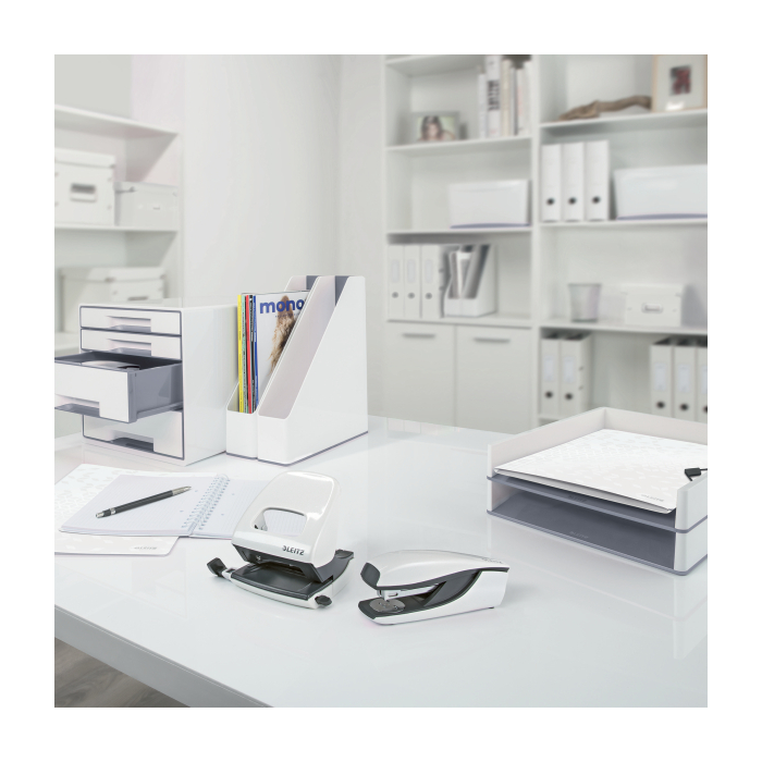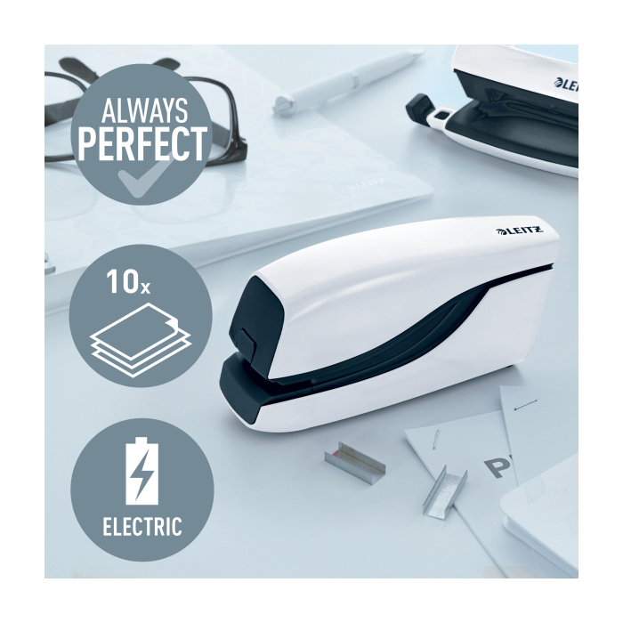 Elektrická zošívačka Leitz New NeXXt WOW. Vďaka jednoduchému ovládaniu jednou rukou je ideálna na časté používanie. Technológia s napájaním na batérie na zošívanie v pohybe. V žiarivých farbách WOW. Batérie (4× 1,5 V AAA LR03) nie sú súčasťou balenia. Kapacita 10 listov. Náhradné spinky ES556800. Farba biela.