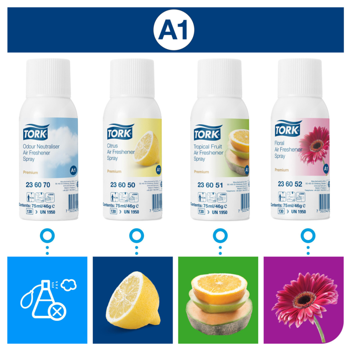 Osviežovač TORK Elevation. TORK zásobník na osviežovač vzduchu má výnimočné funkcie v každom detaile, vysoké praktické využitie a jednoducho sa udržiava. Flexibilné umiestnenie pre rôzne typy toaliet a umyvární. Náplne s rôznymi vôňami vyplnia atmosféru akejkoľvek toalety a umyvárne. Jednoduché programovanie udržiava vzduch čerstvý 24 hodín. Indikátor dopĺňania na lepšiu reguláciu vône. Rýchle dopĺňanie a batéria s dlhou výdržou na jednoduchú údržbu. Napájané 2 monočlánkami C. Nie sú súčasťou dodávky. Používajte výhradne kvalitné alkalické batérie, inak nie je záruka správneho fungovania! Rozmery 97 × 174 × 60 mm.