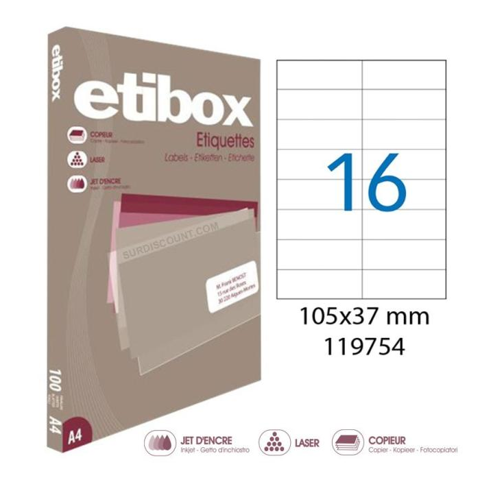 Cenovo výhodné etikety vhodné do laserových a atramentových tlačiarní, ako aj kopírovacích strojov. Rozmery: 105x37 mm Počet etikiet: 1600 Balenie: 100 hárkov