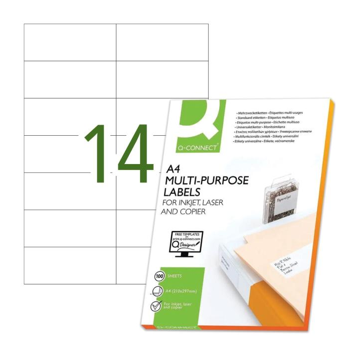 Univerzálne samolepiace etikety pre laserové a atramentové tlačiarne a kopírovacie zariadenia. Formát A4. Farba biela. Balenie 100 hárkov. Etikety na hárku 14 ks.