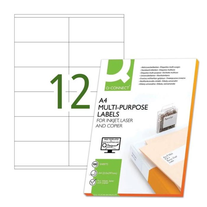 Univerzálne samolepiace etikety pre laserové a atramentové tlačiarne a kopírovacie zariadenia. Formát A4. Farba biela. Balenie 100 hárkov. Etikety na hárku 12 ks.
