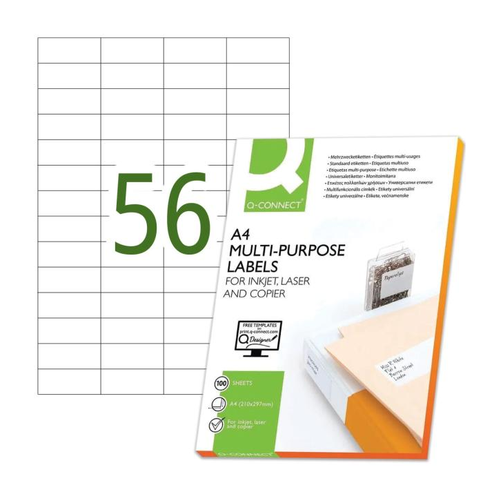 Univerzálne samolepiace etikety pre laserové a atramentové tlačiarne a kopírovacie zariadenia. Formát A4. Farba biela. Balenie 100 hárkov. Etikety na hárku 56 ks.