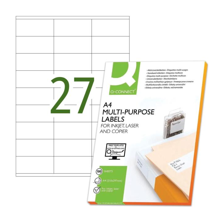 Univerzálne samolepiace etikety pre laserové a atramentové tlačiarne a kopírovacie zariadenia. Formát A4. Farba biela. Balenie 100 hárkov. Etikiet na hárku 27 ks.
