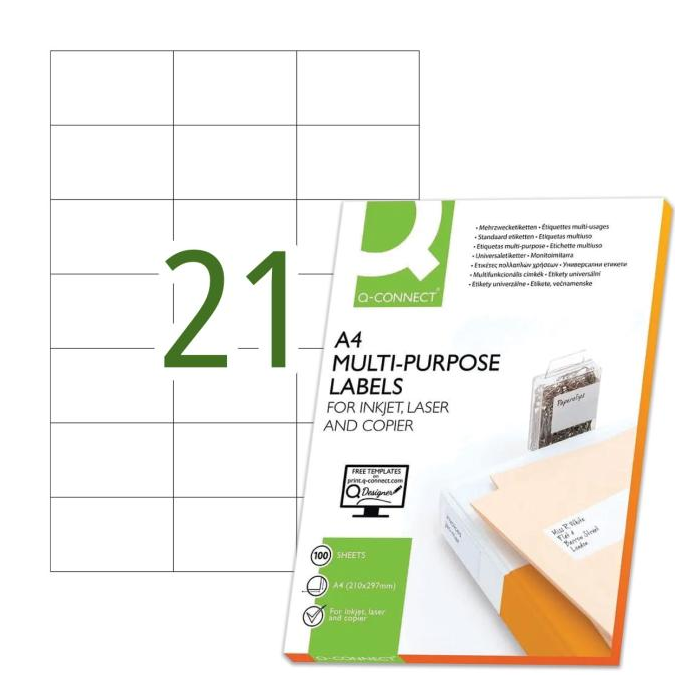 Univerzálne samolepiace etikety pre laserové a atramentové tlačiarne a kopírovacie zariadenia. Formát A4. Farba biela. Balenie 100 hárkov. Etikiet na hárku 21 ks.