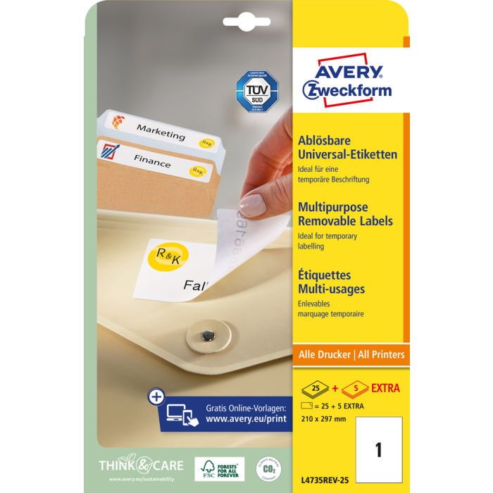 Etikety univerzálne odnímateľné 210x297mm Avery A4 25+5 hárkov