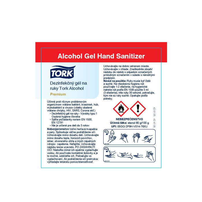 Tork Alcohol gélový dezinfekčný prostriedok s 80 % obsahom denaturovaného liehu efektívne ničí mikroorganizmy a pomáha tak predísť šíreniu infekcií. Efektívny voči rôznym organizmom vrátane obalených vírusov, norovírusov a rotavírusov. Ideálny na každodennú hygienu rúk aj v zdravotníctve. Vhodné na použitie s Tork zásobníkom na mydlá a dezinfekčné prostriedky (S4).