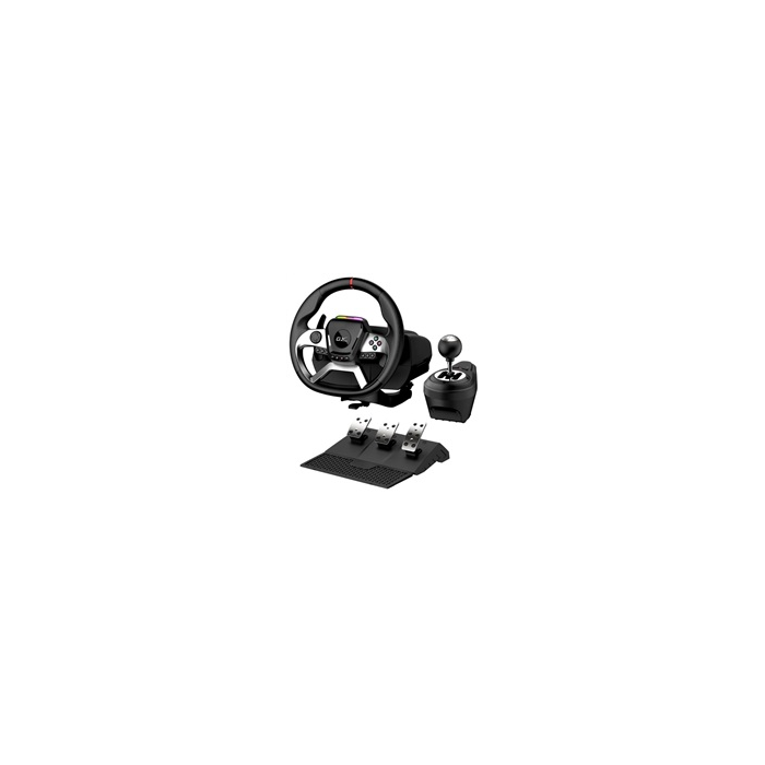 Volant, pedále a radenie pre PC, PlayStation 4 a Xbox One. Volant SpeedMaster X5 FF ponúka až 1080° uhla otáčania, ktorý sa prispôsobí vašim jazdným návykom a poskytuje tak skvelý zážitok zo závodných hier aj simulátorov. Je vybavený 6-stupňovou radením, spätnou väzbou, duálnym vibračným motorom a tiež systémom troch pedálov, navyše disponuje akčnými tlačidlami. Volant je vybavený mechanizmom na upevnenie na stôl. Súčasťou balenia je adaptér z USB-C na USB-A.