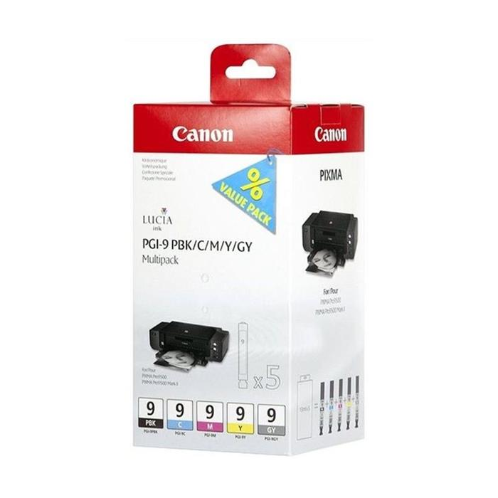 multipack CANON PGI-9 balenie obsahuje: 1x PGI-9 photo black 1x PGI-9 cyan 1x PGI-9 magenta 1x PGI-9 yellow 1x PGI-9 gray