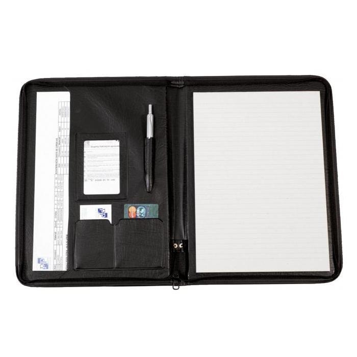 Konferenčná mapa so zipsom, vybavená vreckami niekoľkých veľkostí a linajkovým poznámkovým blokom, bez mechaniky. V prevedení imitácie kože, úprava matná. Šírka chrbta 20 mm. Farba: čierna Prevedenie: imitácia kože matná