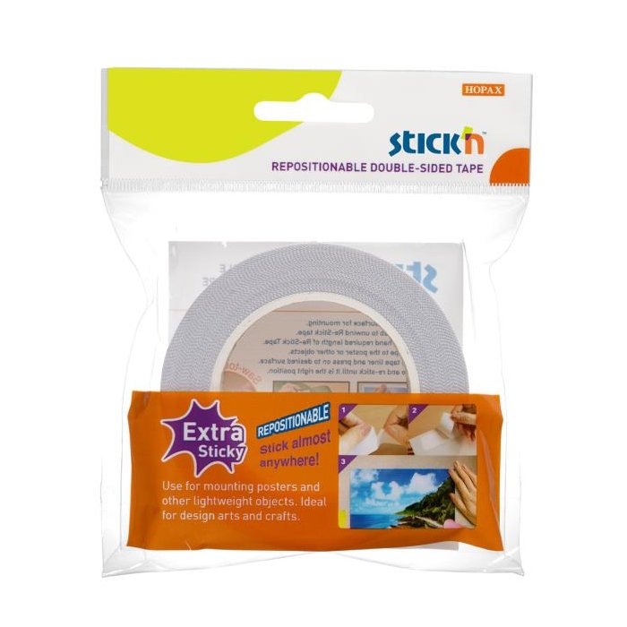 Obojstranná samolepiaca páska Stick‘n by Hopax so silnou lepivosťou pri pripevňovaní dekorácií, plagátov, fotografií alebo iných ľahkých papierových predmetov. Veľmi ľahká aplikácia aj bez nožníc. Vďaka pílovitému okraju ju možno ľahko a úhľadne odtrhnúť rukou. Po nalepení môžete pásku jednoducho odlepiť a znovu použiť. Po odlepení nezanecháva na povrchu žiadne stopy po lepidle. Farba biela. Rozmery 12 mm x 12 m.