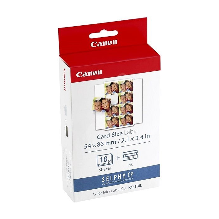 Ink/Film Náplň pre tlačiareň Canon SELPHY CP 100/200/220/300/330/400/500/510/520/600/710/720/730/740/750 SELPHY CP 1000/1200/1500 obsahuje 18 ks papiera 54x86 mm (mini nálepka/8ks na liste) a 1 ks náplne na 18 listov do tlačiarne SELPHY 54 x 86 mm (2,1 x 3,4") veľkosť karty KC-18IL Vyžaduje voliteľnú kazetu na papier