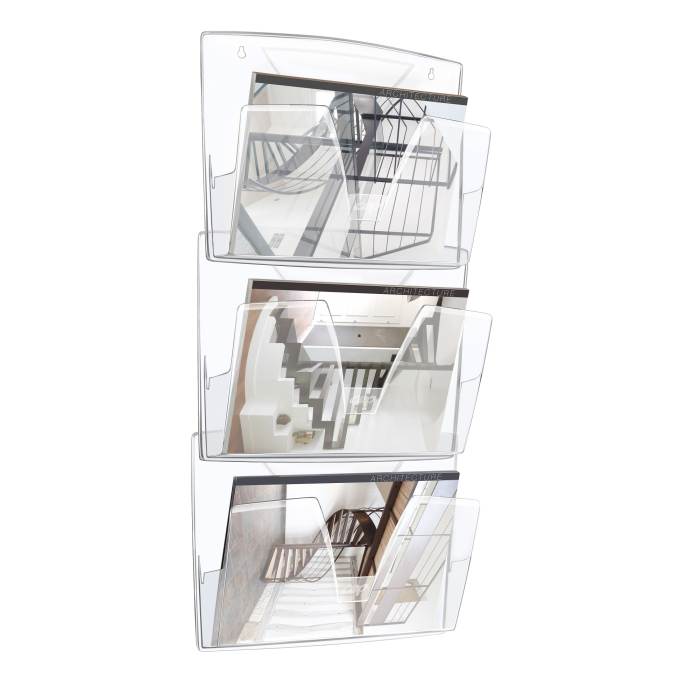 Panel s tromi odkladačmi na triedenie pošty pre dokumenty formátov do 24 × 32 cm s možnosťou zavesenia odkladačov spolu alebo každého separátne. Postranný „U“ rez udrží obálky A3+. Materiál nárazuvzdorný recyklovaný polystyrén. Rozmery jedného odkladača (š × v × h) 361 × 270 × 86 mm. Dodávané vrátane montážnych skrutiek. Farba číra.