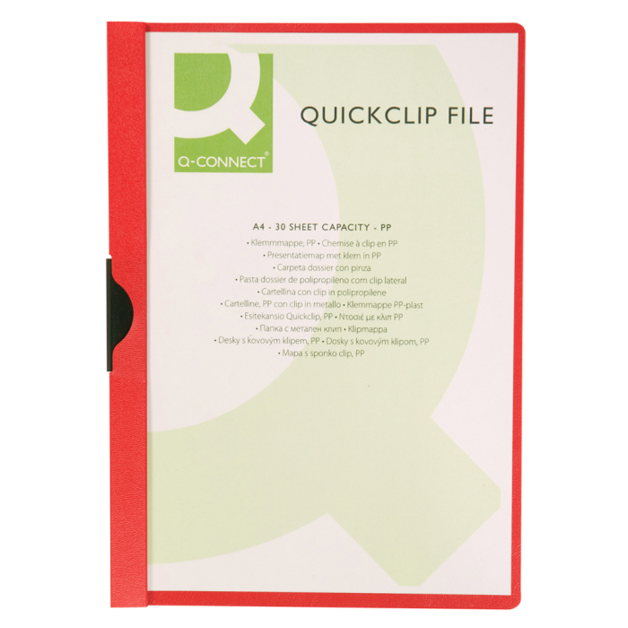 Obal z pevného polypropylénu s priehľadnou prednou stranou a kovovým vyklápacím klipom v čiernej farbe. Formát A4. Kapacita 1 - 30 listov. Väčšie balenie 25 ks. Farba červená.