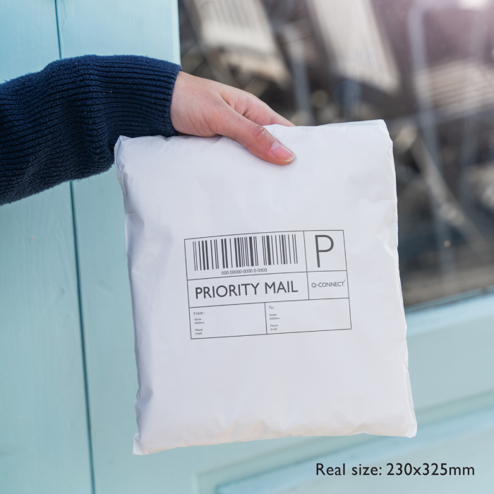 Biele nepriehľadné plastové obálky Q-Connect s čiernym vnútrom, vyrobené zo 100 % recyklovaného materiálu. Trojvrstvová odolná PE fólia 50 mic. Kuriérske tašky sú odolné, vodeodolné, odolné voči roztrhnutiu a prepichnutiu. Majú pevný jednopáskový samotesný uzáver. 100 kusov v krabici.