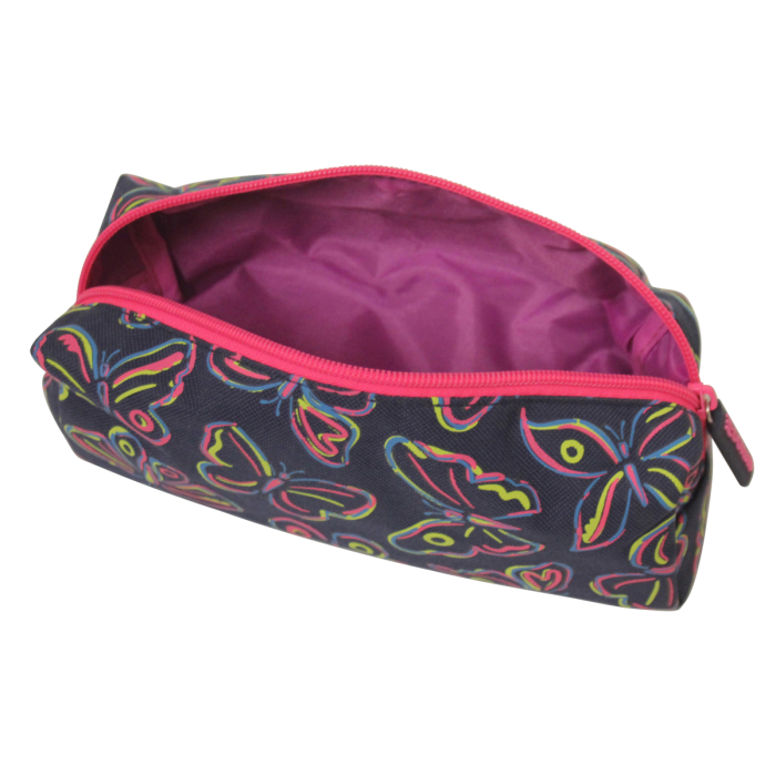 Puzdro na perá s jedným zipsom, dva rôzne tvary a farby, polyesterový materiál, farebná podšívka. Rozmery peračníka Motýle (D x Š x V): 22 x 8 x 7,5 cm / Rozmery peračníka Kvety: 21,5 x 8 x 8 cm