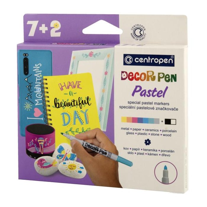 Sada 8 pastelových odtieňov a 1 biely popisovač určený k dekorácii rôznych materiálov (lakový papier, kov, sklo, fólia, keramika, kraslica, kameň). Svetlostály pigmentový atrament na vodnej báze. Stopa písma je výrazne sýta, permanentná, svetlostála. Po dokonalom zaschnutí (min. 4 hod.) sa stopa stáva odolnou voči oteru a na poréznych povrchoch i vode. Z neporéznych materiálov možno zmyť vodou so saponátmi. Šírka stopy 1,5 mm. Skladujte vo vodorovnej polohe.