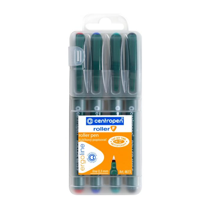 Sada 4 rollerov v základných farbách náplne a novom ergonomickom dizajne s jemným kovovým hrotom s guľôčkou z karbidu wolfrámu a nevysychajúcim atramentom (vydrží 14 dní bez vrchnáka). Šírka stopy 0,3 mm, dĺžka stopy 2200 m.