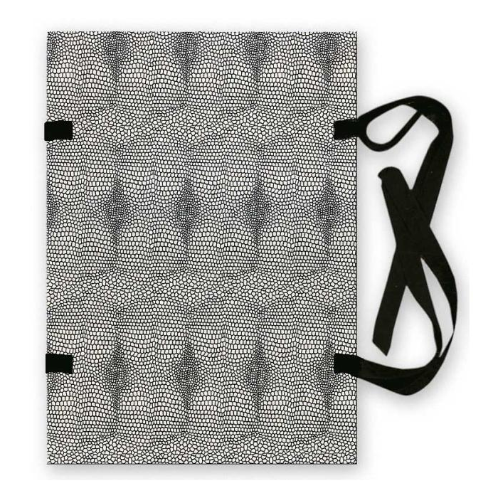 Jednostranne poťahované kartónové dosky bez chrbta, spojené šnúrkami. Vyrobené zo strojnej lepenky s gramážou 1 050 g. Prevedenie hadia koža. Formát A4. Väčšie balenie 25 ks. Farba: čierna/biela
