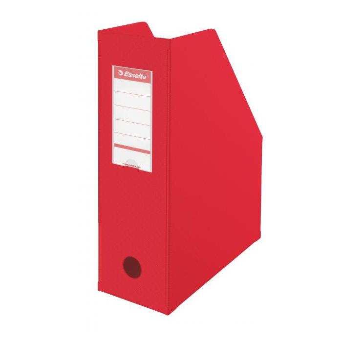 Skladací ohybný stojan z PVC na materiály do formátu A4 s otvorom na chrbte a vymeniteľným popisovateľným papierovým štítkom. Rozmery (v×h) 32×24 cm, šírka chrbta 10 cm. Väčšie balenie 10 ks. Farba: červená Šírka chrbta: 10 cm
