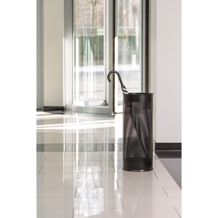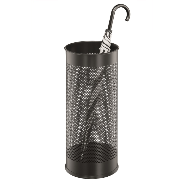 Štýlový stojan na dáždniky vysokej kvality s dekoratívnou perforáciou vyrobený z ocele. Ideálny do vstupných priestorov, domácností a kancelárií. Objem 28,5 l, výška 620 mm, priemer 260 mm. Materiál: oceľ Farba: čierna