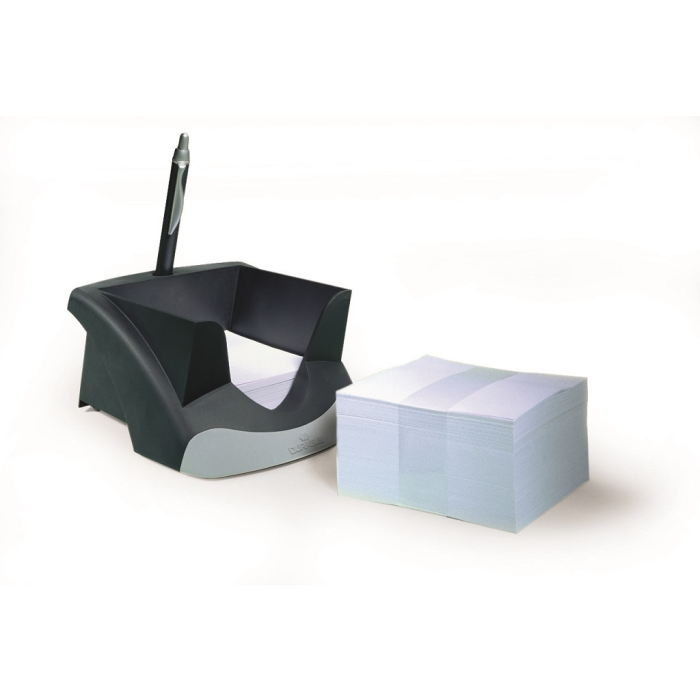 Štýlový stojan na bloky v dizajne produktovej rady DURABLE VEGAS dodávaný s 500 papierikmi bielej farby rozmerov 90×90 mm. Ľahký prístup k papierikom, priestor na pero, protišmyková úprava. Rozmery (š×v×d) 116×70×153 mm. Farba: čierna/sivá