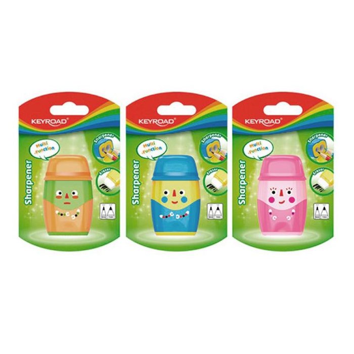 Strúhadlo KEYROAD Hello plastové s dvomi otvormi a gumou, blister, mix farieb