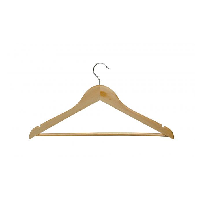 Klasický vešiak na šaty z masívneho buku s otočným kovovým háčikom. Vhodný na suchý aj mokrý odev. Veľmi pevný, udrží aj ťažké bundy. Zvlášť vhodný pre tradičné dekorácie alebo do skríň. Príjemný na dotyk. Rozmery 45 × 22 cm, priemer háčika 4 cm. Farba prírodná.