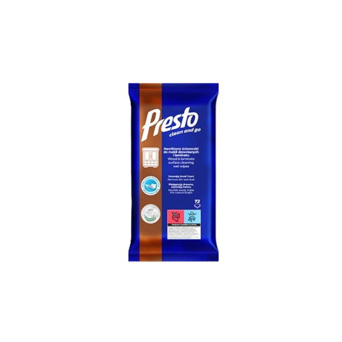 PRESTO DREVO VLHČENÉ UTIERKY 72 KS. Presto Clean vlhčené utierky na drevo sú praktickým a efektívnym pomocníkom pri každodennej starostlivosti o drevené povrchy. Tieto špeciálne navrhnuté utierky nielen čistia, ale aj ošetrujú drevo, čím pomáhajú udržiavať jeho prirodzený lesk a krásu. Sú ideálne na odstraňovanie prachu, škvŕn a nečistôt z rôznych drevených povrchov v domácnosti, vrátane nábytku, políc, dverí a dekoratívnych predmetov. Vďaka svojmu zloženiu utierky Presto Clean obnovujú lesk dreva, chránia ho pred vysychaním a zabraňujú usádzaniu prachu. Ich použitie je veľmi jednoduché - stačí nimi pretrieť povrch a nechať zaschnúť bez potreby ďalšieho leštenia. Navyše, utierky zanechávajú príjemnú vôňu a nepoškodzujú lakované ani neošetrené drevo. Hlavné vlastnosti: Efektívne čistenie a ošetrenie drevených povrchov. Obnovujú prirodzený lesk a chránia pred vysychaním. Odstraňujú prach, škvrny a nečistoty. Jednoduché použitie bez potreby ďalšieho leštenia. Zanechávajú príjemnú vôňu.