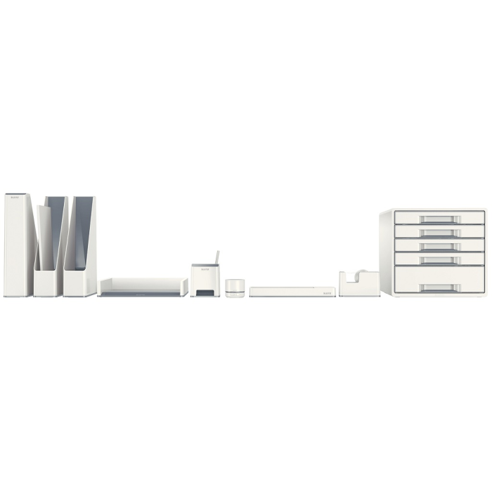 Box, dopĺňajúci produktovú radu Leitz WOW. Ľahko vysúvateľné 4 malé a 1 veľká zásuvka so zarážkou proti úplnému vysunutiu, jednoduché otváranie a zatváranie. Gumové nožičky pre lepšiu stabilitu, rozlišovač na popis zásuvky. Rozmery 287 × 270 × 363 mm. Farba perleťovo biela.