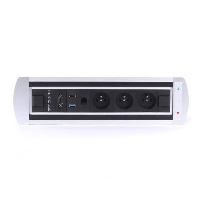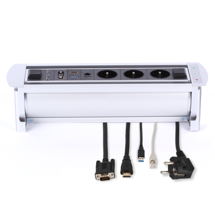 • prípojné miesto je pohodlne k dispozícii priamo na pracovnom stole • otáčanie pomocou elektromotora a magnetickej spojky • vybavenie: 3× elektrická zásuvka 1x data 1x VGA 1x USB 3.0 1x HDMI • bezpečnostná fotobunka proti uzatvoreniu pri používaní • rozmery: 40,3 × 11 × 10,3 cm • hmotnosť: 3 kg